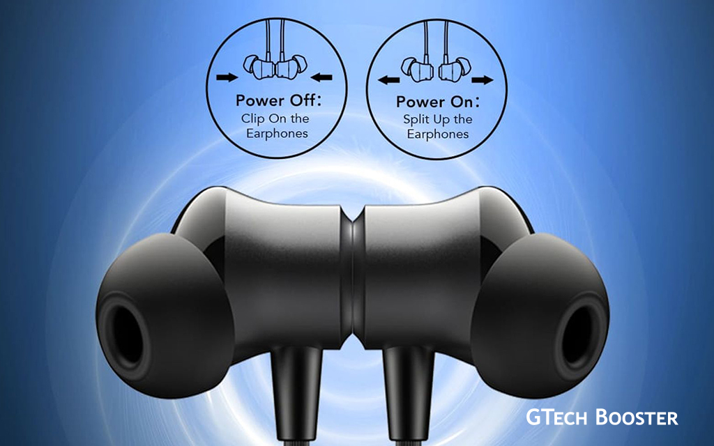 Oraimo Necklace 5 features an automatic power system tied to its magnetic earbuds. Separating the earbuds instantly powers it on. To turn off, Clip the magnetic earbuds together to auto-power off and save battery. Unclipping repeats the on process for quick use.