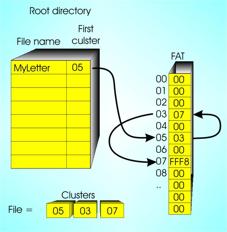So to read a file you first find its name, MyLetter say, in the root directory. You then know the number of the first block that it uses to store data – say block 05. You can now read block 05 and process the data it contains.
