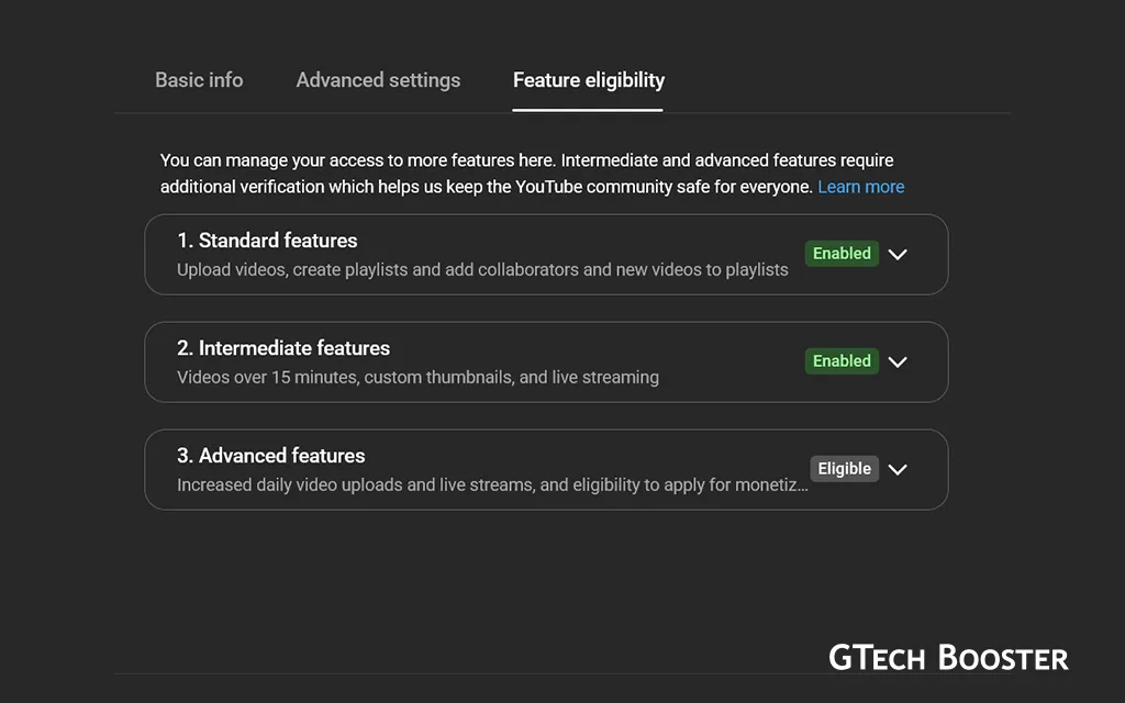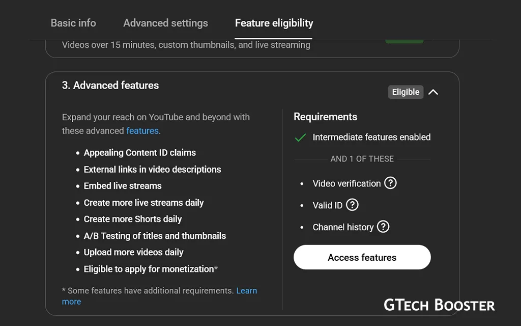 Advanced features on YouTube include things like the ability to upload videos longer than 15 minutes, add custom thumbnails, live stream, appeal Content ID claims, and link external sites. They’re tied to what YouTube calls “channel standing” — not just age.